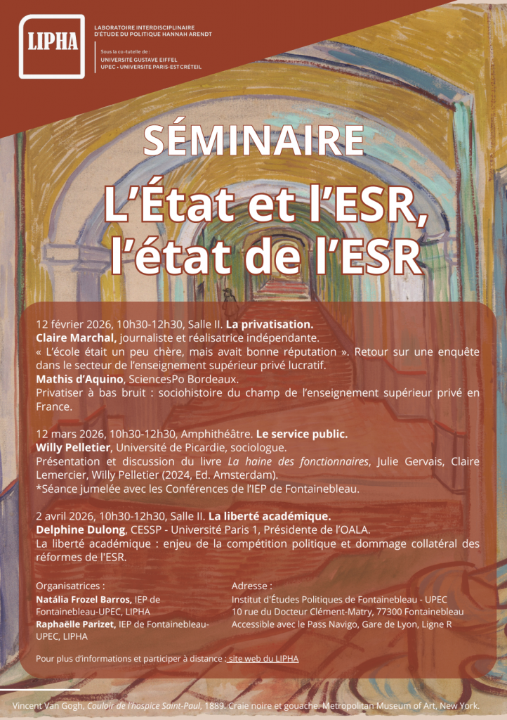 Le Laboratoire interdisciplinaire d’étude du politique Hannah Arendt (LIPHA) des Universités Paris Est Créteil et Gustave Eiffel, partenaire institutionnel de l’AFSP, organise en 2026 un nouveau séminaire intitulé « L’État et l’ESR, l’état de l’ESR ». Ce cycle de trois séances (en mode hybride à l’IEP de Fontainebleau et en visio) proposera une analyse sociologique des conditions actuelles de travail dans l’ESR, en s’appuyant sur les politiques universitaires en cours et leurs effets sur l’ensemble de la communauté universitaire.